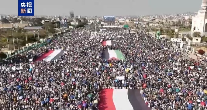 rr总台报道员 哈桑·巴姆沙姆斯:在美国总统特朗普发表有关驱逐加沙地带巴勒斯坦人的言论以及加沙地带停火协议执行受阻的背景下,萨那南部的一处广场再次举行集会,表达对特朗普言论的强烈反对。同时胡塞武装也做好了重新迎接军事冲突的准备。